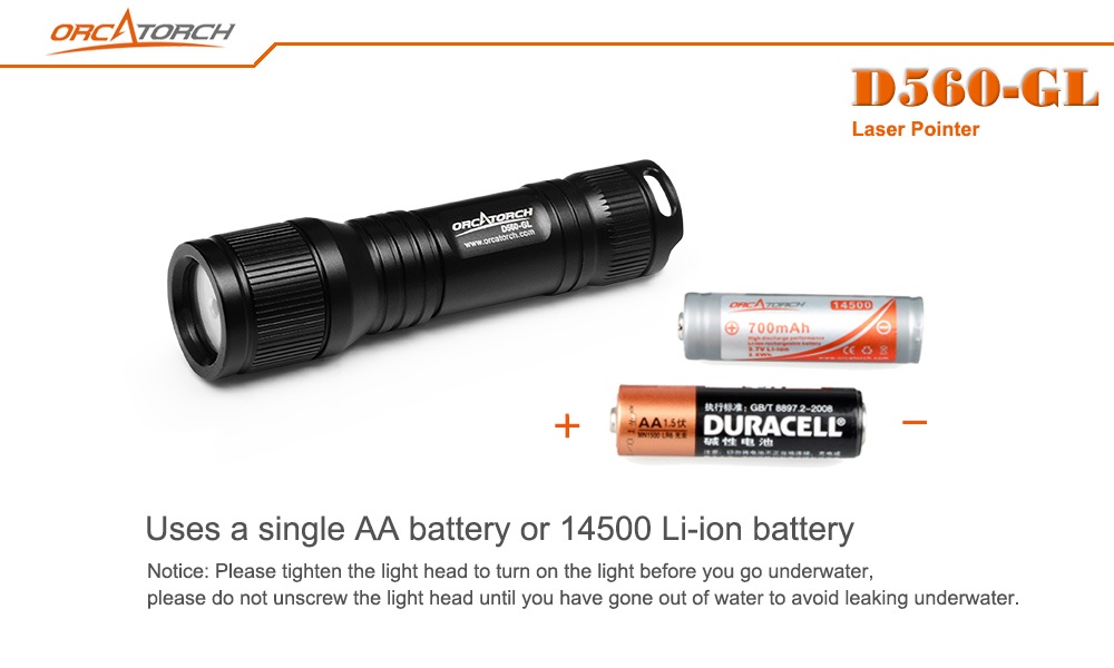 - OrcaTorch D560-GL is a scuba diving laser dive light specially designed for instructors and underwater commercial divers. It delivers 5mW Green Laser with 520nM wavelength. Powered by one 14500 rechargeable Li-ion battery or AA battery, the max runtime can be 5 hours.