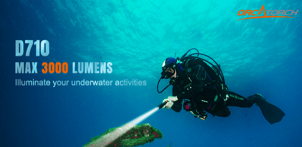 - Whether you’re a recreational or a professional diver, you’ll find the ORCATORCH D710 dive light useful in your underwater activities. With max 3,000 lumens, the D710 is one of the strongest torches in its class. But, you have plenty of brightness settings to choose from if you prefer less power. It runs on one OrcaTorch 21700 5000mAh rechargeable battery with Type-C charging port, easier for you to charge it anywhere.