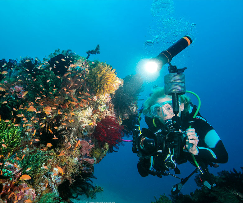 OrcaTorch D950V is a 10500 lumens LED video light specially designed for underwater photo/videography, color temperature 5700K, CRI, RA92.