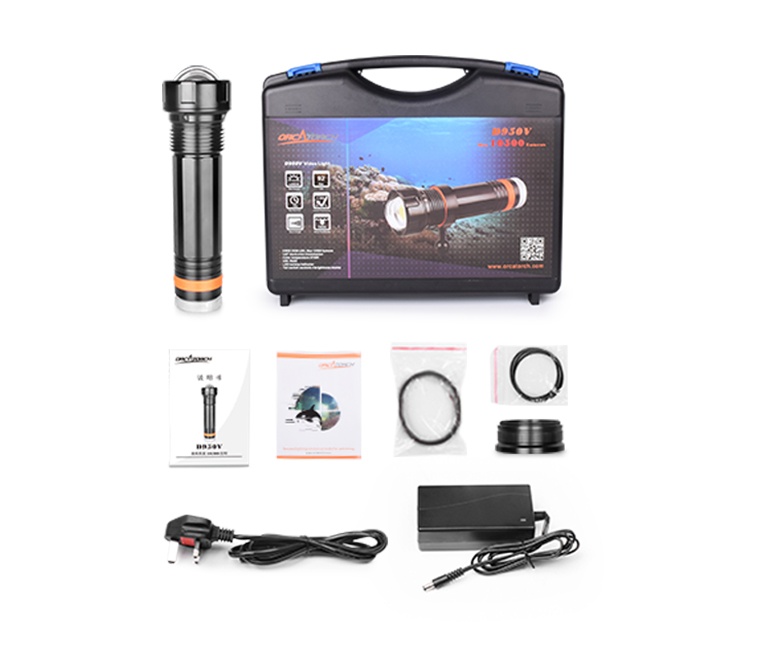 - OrcaTorch D950V is a 10500 lumen LED video light specially designed for underwater photography. It features a CREE chip-on-board (COB) high power LED. The spherical toughened glass optical lens design can create even illumination with 120°wide angle beam. The tail LED indicator instantly displays the battery’s remaining charge.